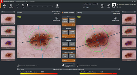 In contrast, hand-held dermatoscopes give only 10x magnification and polarisation. Without the use of technology, the individual photographing of lesions can easily lead to error in locating the same lesion in the future.